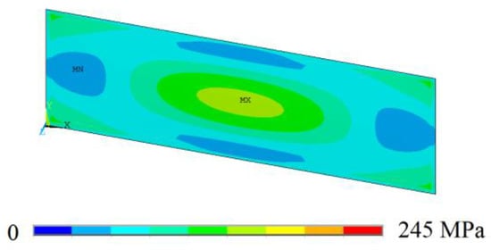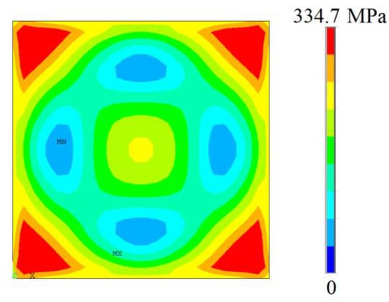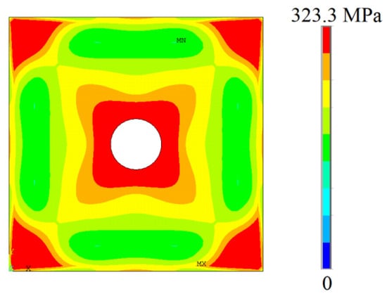 For the verification of the model according to Shanmugam and Narayanan [], one can note in Figure 6 that the greatest stress points are located in the center of the plate.
