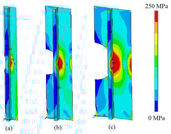 The von Mises stress distribution for the stiffened plate with semi-circular opening and width of (a) 170 mm, (b) 340 mm, and (c) 510 mm.