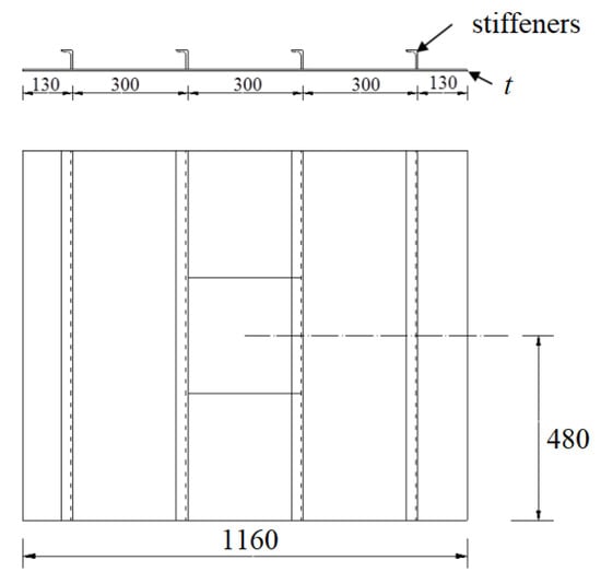 To finish the computational model verification step, the numerical study carried out by Yu et al. [] was reproduced here. To do so, the elastoplastic buckling of a simply supported rectangular stiffened plate with a square centered hole was analyzed, being the structure under uniaxial compression combined with uniform lateral loading. Figure 11 illustrates the stiffened perforated plate, which has the following dimensions: 1160 mm, b 960 mm, t = 5 mm and 12 mm (defining a plate slenderness ratio, respectively, of 2.45 and 1.02), and 300 mm for the centered square perforation. Moreover, the L-shaped stiffeners have dimensions of 30 mm, 50 mm, and 5 mm (see Figure 9 for the stiffener geometry). The metallic material used for the plate and stiffeners has the following mechanical properties: E = 198 GPa, 0.3, and 331 MPa.
