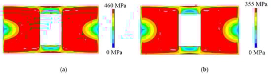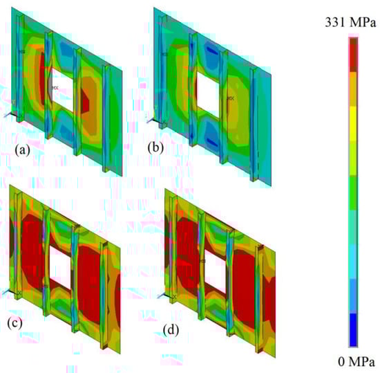 The von Mises stress distribution for the stiffened plate with centered square hole, with (a) t = 5 mm and , (b) t = 5 mm and , (c) t = 12 mm and , and (d) t = 12 mm and .