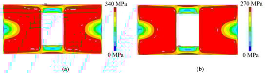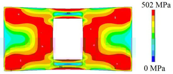To define the spatial discretization, a mesh convergence test was performed for the plate made of AH-36 steel, defining a regular independent mesh with an element size of 30 mm. Therefore, the numerical simulations for the case study were carried out with this finite element size. The results obtained for the ultimate biaxial buckling stress () and maximum out-of-plane displacement () for each case are presented in Table 12. Moreover, the von Misses stress distribution for the perforated plate made of AISI 4130 steel, AH-36 steel, spheroidal graphite iron (SGI), compact graphite iron (CGI) and Al 7075-T651 aluminum alloy are illustrated in Figure 15, Figure 16 and Figure 17.
