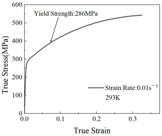 The mechanical behavior of the 7050 aluminium alloy was tested at a constant strain rate of 0.01 s −1 based on the actual cold expansion rate, as shown in Figure 1. At room temperature, the yield strength of 7050 aluminum alloy with a strain rate of 0.01 is 286 MPa, Young’s modulus is 75 GPa, and Poisson’s ratio is 0.3.