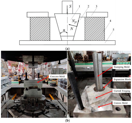 Cold expansion of forging: (a) schematic diagram: 1—stamping mold; 2—expansion block; 3—concave mold; 4—curved frame forging; 5—convex mold; (b) experiment.