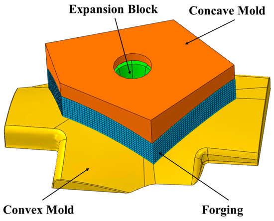 After quenching, a numerical simulation model of the cold expansion process of the curved frame forging was established in ABAQUS by taking the calculated quenched residual stress as the predefined initial stress. The cold expansion model was shown in Figure 4, where the concave mold, forging, convex mold, and expansion block were in contact. The mesh type of the other instances (concave mold, convex mold, and expansion block) is a discrete rigid body with adaptive meshing. The residual stress distribution after cold expansion deformation ratios of 1%, 2%, and 3%, via the friction coefficient of 0.1, and the number of expansion blocks of 8, were predicted in numerical simulation.
