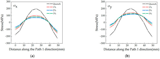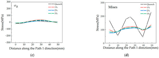 The quenched residual stress in the forging was reduced to varying degrees after cold expansion. The distribution of stress in the X-direction (σx), Y-direction (σy), Z-direction (σz), and Mises was observed, as shown in Figure 6. The results revealed that 2% cold expansion rate of was most effective for reducing quenched residual stress. From the result, it could be seen that the magnitude of σz was within ±40 MPa, both before and after the cold expansion. However, after quenching, the stress amplitudes of σx and σy are relatively large. The forging surface exhibited compressive stress with a maximum compressive stress amplitude of 221 MPa, and the core exhibited tensile stress with a maximum tensile stress amplitude of 205 MPa. After cold expansion, the stress amplitudes of both σx and σy were reduced to varying degrees, but still exhibited surface compressive stress with a maximum compressive stress amplitude of 119 MPa, and core tensile stress with a maximum tensile stress amplitude of 125 MPa. After quenching, the von Mises stress along path 1 show a W-shaped distribution (larger values at the surface and in the core of the forging, and smaller values at the quarter thickness), with a maximum value of 227 MPa. After a 2% cold expansion process, the von Mises stress amplitude of the forgings was reduced to below 120 MPa.