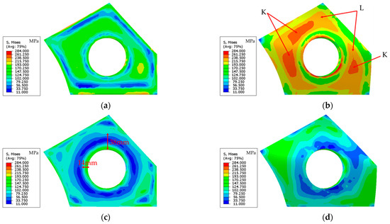 The most effective ratio (2%) was subsequently used. The stress contour maps of the forging after quenching and cold expansion were shown in Figure 7. The distribution of von Mises stress could be seen in the maps. After quenching, the von Mises stress on the surface of the forging reached 283 MPa, and the von Mises stress in the center thickness of the forging reached 210 MPa. After quenching, the von Mises stress in the K region of the forging surface was above 260 MPa, and the von Mises stress value in the L region was above 220 MPa, as shown in Figure 7b. The K and L regions exhibited large stress, and the sum of the two areas occupied 2/3 of the convex surface. After the cold expansion, the von Mises stress on the surface of the forging was reduced significantly to below 120 MPa in most areas, as shown in Figure 7d. The von Mises stress in the K and L regions was effectively relieved. After quenching, it was observed that the stress in most areas of the central layer was below 210 MPa, and the stress did not exceed 80 MPa in the edge areas of the central layer shown in Figure 7a. After cold expansion, it was seen that the stress in most areas of the central layer of the forging was reduced to 135 MPa below, and the stress was displayed a circular distribution with an amplitude of 65 MPa or less in the area 14 mm to 38 mm from the expansion hole, as shown in Figure 7c.