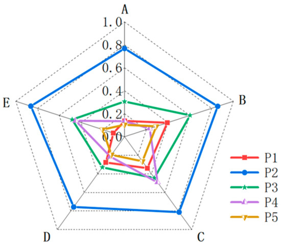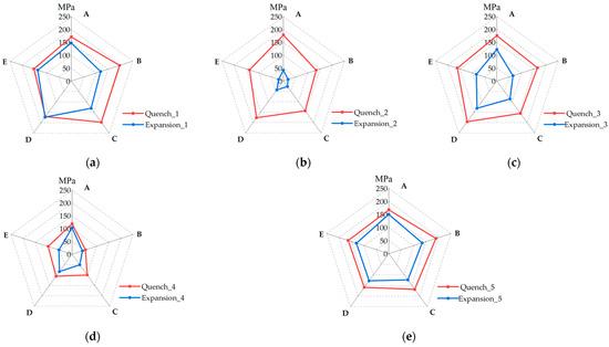 The effectiveness of the cold expansion residual stress reduction method was evaluated by comparing the stress distribution in curved frame forging after quenching and cold expansion. The forging was divided into five regions by five pentagons (P1, P2, P3, P4, P5) depending on the gradient of the von Mises stress cloud diagram. As in Figure 8, taking the intersection of O`A, O`B, O`C, O`D, O`E and P1, P2, P3, P4, and P5 at the center thickness of the forging, and von Mises stress radar maps were plotted after quenching and cold expansion of the forging as shown in Figure 9. Quench_1 represented the von Mises stress of region P1 after quenching, Expansion_1 represented the von Mises stress of region P1 after cold expansion, and so on. The ABCDE in the radar diagram corresponds to the ABCDE of the forgings.