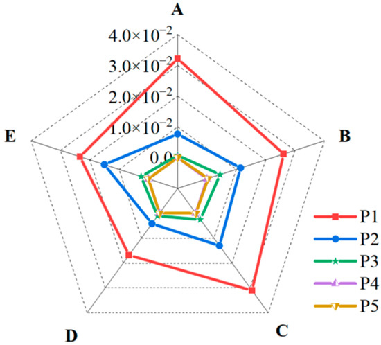 The von Mises stress in the centre thickness of the forging had been reduced after cold expansion. The intersection points of O`A, O`B, O`C, O`D, O`E, and P1, P2, P3, P4, P5 at the centre thickness of the forging were taken to obtain the residual stress magnitude, and the residual stress reduction rate was calculated (Figure 13).