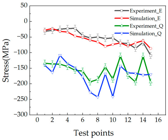 Comparison of the experimental data and the simulated results. Experiment_E is the measured stress after cold expansion; Simulation_E is the simulated stress after cold expansion; Experiment_Q is the measured stress before cold expansion; and Simulation_Q is the simulated stress before cold expansion.
