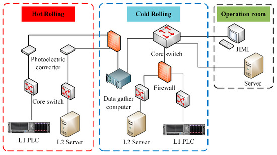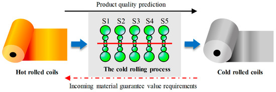 With the rapid advancement of society, the market has put forward higher requirements for the quality of cold-rolled strip products, such as external dimensional accuracy, surface quality, and thickness accuracy. However, strip production is a complex industrial system consisting of smelting, continuous casting, hot rolling, cold rolling, and post-treatment processes, which has the characteristics of multiple processes coupled, quality heritability, and nonlinear influencing factors. As shown in Figure 1, the hot rolling line produces strips that become the raw material for cold rolling after heating, high-pressure descaling, rough rolling, finish rolling, laminar cooling, and coiling processes. Due to the radiation, convection, and conduction factors of the hot rolling production process leading to partial heat loss of the strip, the actual finish rolling temperature and actual coiling temperature of each roll of the hot-rolled strip are different, resulting in differences in the mechanical properties of the hot-rolled strip, which has a hereditary effect on the deformation resistance during the cold rolling process. Cai et al. [1] have verified that the finish rolling temperature and coiling temperature have a non-negligible impact on the cold-rolled strip’s initial deformation resistance by experiments at different hot rolling temperatures.