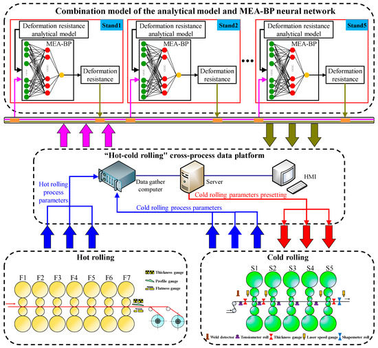An online model is proposed for predicting deformation resistance in the strip tandem cold rolling by combining the back propagation neural network optimized by the mind evolutionary algorithm (MEA-BP) and the deformation resistance analytical model. The real-time collection of hot and cold rolling process data is achieved by constructing a “hot and cold rolling” cross-process data platform. Based on this, a dataset including historical production data of hot and cold rolling is established to train and test the model. The application result of the proposed model shows that the deformation resistance prediction error can be reduced from ±12% to ±5% compared with the traditional analytical model, which demonstrates the model established in this work can effectively improve the prediction accuracy of the deformation resistance in the strip tandem cold rolling.
