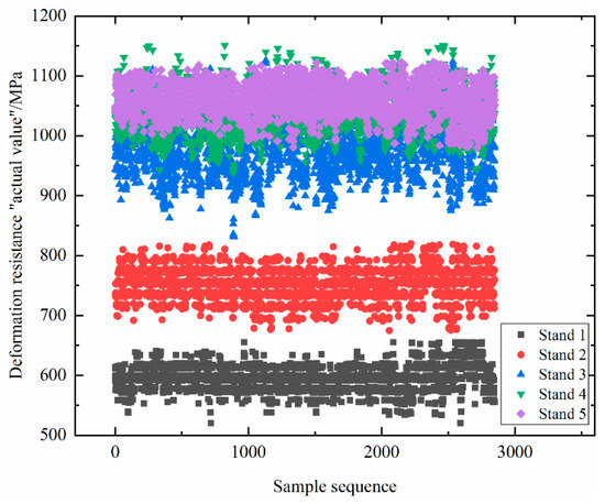 The main mechanical equipment parameters of the tandem cold mill are shown in Table 1. Relying on the “hot-cold rolling” cross-process data platform, 2848 historical rolling data of strip material MRT-4 are collected. The MRT-4 is the main raw material for tinplate and includes the chemical compositions C, Si, Mn, P, S, N, etc. It is the main product of the application production line, accounting for a large proportion of the overall output. Each cold rolling stand’s “actual” deformation resistance values are calculated according to Equation (8), and Figure 5 shows the data distribution for each stand.
