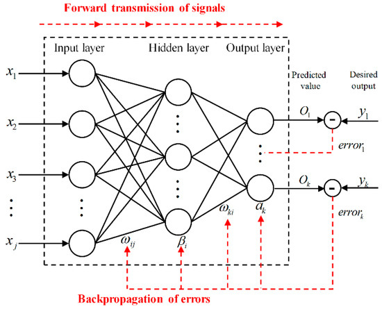The first step of BP is the forward transmission of the signal. The input value of the network is transmitted from the input layer to the hidden layer through the weighting process, and the hidden layer’s output value is acquired after the activation function of the hidden layer is used. The hidden layer’s neurons for input and output are calculated as shown in Equations (15) and (16), respectively. The output layer’s neurons for input and output are expressed as shown in Equations (17) and (18), respectively [21].