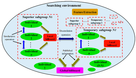 Figure 7 shows the structural framework of MEA, which mainly consists of “Groups”, “Subgroups”, “Billboard”, “Search Environment”, and so on. Among them, the global billboard is used to post the information of each subgroup and compare the scores of each subgroup. Individuals within a subgroup post their respective messages and compare scores at a local billboard, performing similar-taxis operations. The score function M(x) is as follows [23]: