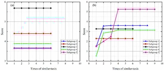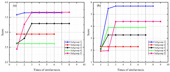 - Similar-taxis operation. The process by which individuals compete with each other to become the new superior within all subgroups, with the superior individuals of the subgroup at the center, is called similar-taxis. Until no new superior individual is produced, then the subgroup is said to be mature, the similar-taxis process of the subgroup is finished, and the latest superior individual score is defined as the subgroup score. As shown in Figure 8a,b, most subgroups keep producing new superior individuals, and their scores keep increasing until they finally stabilize, while some other subgroups have no change in their scores because they have not produced new superior individuals.