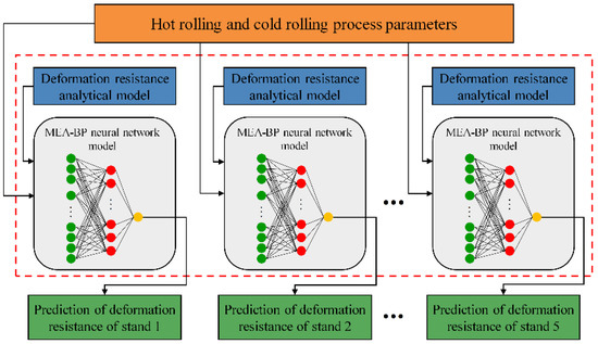 The core of the mind evolution algorithm (MEA) simulates the evolutionary process of human thinking. It not only absorbs the ideas of “group” and “evolution” from the GA but also overcomes the shortcomings of the evolutionary algorithm itself and has fast learning, good adaptability, and a more robust ability to solve nonlinear numerical problems [15,16]. Sun et al. [17] showed experimentally that the MEA’s global convergence rate and computational efficiency were improved by more than 20% in nonlinear numerical optimization problems compared to the GA. The studies demonstrate using MEA to optimize neural networks can fully utilize the advantages of both algorithms and improve the performance of neural network models. The data penetration between processes is currently realized, and the feasibility of cold rolling deformation resistance prediction based on the hot rolling process data is available. Therefore, this paper first builds a “hot-cold rolling” cross-process data platform at a rolling industrial site to achieve real-time access to historical production data of hot and cold rolling. Based on obtaining accurate hot rolling data, construct a deformation resistance prediction model by combining the BP neural network optimized by the MEA and the analytical model, given the advantages of the artificial intelligence algorithm and the rigorous theoretical system of the analysis model itself. As shown in Figure 3, the model constructs small networks with the same structure for each stand separately. The actual production data of hot and cold rolling are used for the training of the small network model to make it learn the nonlinear hot, and cold rolling is influencing factors and then make an accurate prediction of deformation resistance for each stand, followed by the completion of the presetting of cold rolling related parameters. Finally, the prediction accuracy and generalization performance of the model are evaluated by historical production data collected by the data platform.