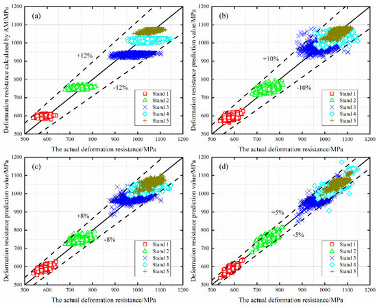 Figure 13a–d shows the prediction results of AM, BP, GA-BP, and MEA-BP-AM models for the test set. As shown in Figure 13a, the error distribution of the deformation resistance calculated using the AM is ±12%, and the linearity between the computed results and the actual deformation resistance is poor. As shown in Figure 13b,c, the errors of the predicted deformation resistance using the BP and the GA-BP were distributed at ±10% and ±8%, respectively, and the optimization of the BP neural network by GA improved the prediction accuracy the BP for cold rolling deformation resistance. As shown in Figure 13d, the error of the prediction results of cold rolling deformation resistance by MEA-BP-AM is reduced to within ±5%. The combination of the AM and MEA-BP gives full play to the advantages of both. It improves the prediction accuracy of cold rolling deformation resistance by the analytical and artificial intelligence models alone.