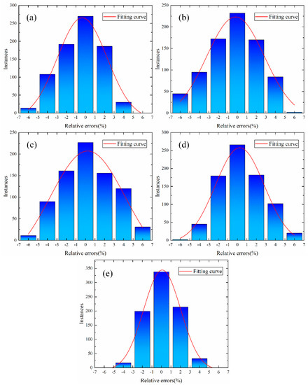 In addition to this, the reasonableness of the distribution of deformation resistance prediction errors is also a measure of the performance of the deformation resistance prediction model. Figure 14 shows the relative error distribution between the deformation resistance predicted for each stand using the MEA-BP-AM model and the actual deformation resistance of each stand. As can be seen in Figure 14, the histogram of the relative error distribution of deformation resistance for any of the five cold-rolled stands is more stable, with the fitted curve showing the shape of a normal distribution centered on 0, low on either side, and high in the middle, and approximately symmetrical, with a better overall performance.