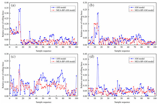 Comparison of rolling force relative error under the AM model and the MEA-BP-AM model. (a) Stand 1; (b) Stand 2; (c) Stand 4; (d) Stand 5.