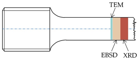 The scanning electron microscope (SEM) model used for the experiments was JEOL JSM 7001F, and the accelerating voltage was 20~25 KV. The equipment was equipped with an electronic backscatter diffraction (EBSD) test system for qualitative analysis of the local strain distribution of the sample. The canning step was 1.00 microns. As shown in Figure 2, along the stretched samples from the fracture position, samples of 5 mm, 5 mm and 0.5 mm in length were taken in turn for the XRD, EBSD and TEM observations, respectively. The surface of observation was perpendicular to the rolling direction.