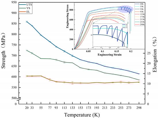 The loading speed was set to 2 mm/min, due to the fact that conventional extensometers cannot be used in cryogenic environments. The crossbeam displacement controlled the deformation rate before the experiments were start, the sample had to be held at the target temperature for 15 min. The tensile machine used for experiments in the range of 77 K to 298 K Was MTS WD-3100; the experiments in the range of 93 K to 298 K were conducted in a cryogenic environmental chamber, where liquid nitrogen was used as the coolant, using programmable temperature control, and the degree of precision for the equipment was 1 K; 77 K experiments were directly immersed in liquid nitrogen, at each temperature for three repeated experiments. The tensile machine used for experiments in the range of 20 K to 55 K was the ETM-105D model universal stretching machine, using mechanical refrigeration and programmable temperature control. The degree of precision for the equipment was 0.5 K, with two repeat experiments at each temperature.