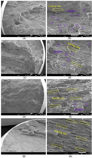 As can be seen from Figure 3, the ultimate strength increases at an accelerated rate when the temperature drops below 113 K. In order to investigate the effect of temperature on tensile properties, we chose four temperatures, 298 K, 213 K, 113 K and 20 K, for the observation of sample fracture. The results are shown in Figure 4. It can be seen that the fracture morphology mainly consists of dimples and tearing ribs with different lengths. At room temperature, the fracture surface undulates, the tearing ribs are short, and there are many dimples dispersedly distributed on the fracture surface. The fracture mode for the sample at room temperature is ductile fracture. As the temperature decreases, the number of dimples gradually decreases, and the tearing ribs become longer and more profound. When the temperature is 20 K, as shown in Figure 4g,h, the fracture morphology appears to be an obvious platform while its surface is relatively smooth. Steps exist between platforms, dimples almost disappear, and tearing ribs become deeper. At this moment, the fracture mode is typical brittle fracture. As for the samples at 213 K and 113 K, both ductile and brittle characteristics can be perceived and a transformation from ductile fracture to brittle fracture is exhibited. The variability of fracture morphology for the same loading rate and specimen size can be attributed to the decrease in deformation temperature, which implicitly suggests that low temperatures lead to a shift in the material fracture mode from ductile fracture to brittle fracture.