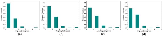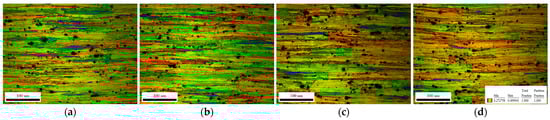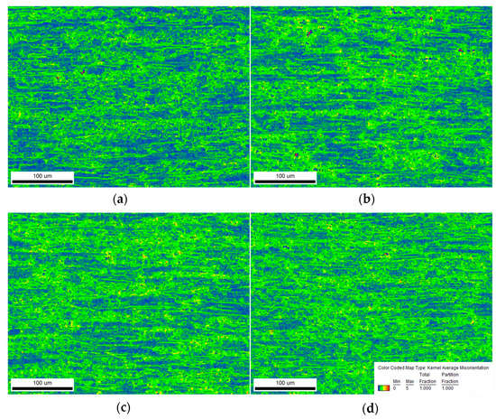 In order to furtherly investigate the microstructure under various cryogenic temperatures, EBSD analysis was employed to reveal the details. Figure 5 shows the samples’ kernel average misorientation (KAM) at different stretching temperatures. KAM is the most commonly used method in regional mismatch angle analysis [23,24]. It is particularly suitable for illustrating the local strain distribution within a crystalline material after deformation. In the Figure 6, the orientation difference of the first nearest neighbor is calculated. The average KAM of the graphs a, b, c, and d are 0.97, 1.09, 1.24, and 1.36, respectively; warm colors indicate more significant local strains, while cool colors indicate more minor ones. As the temperature decreases, the color gradually becomes warm-toned, and the proportion of the area occupied by warm tones increases. This indicates the greater degree of plastic deformation in the samples and that more areas are involved in the deformation.
