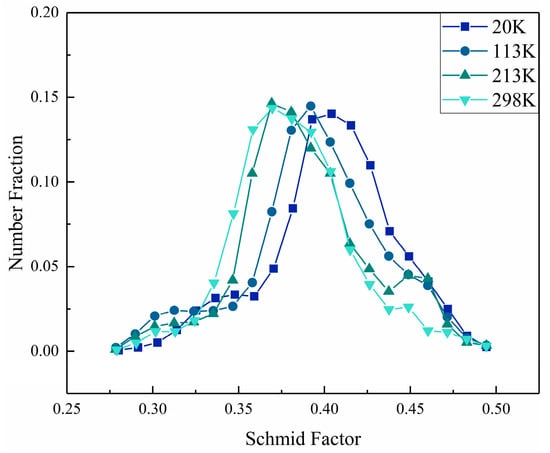 For tensile testing aluminum alloys, plastic deformation is mainly accomplished by dislocation slip. During the initial stage of deformation, different grains have different Schmidt coefficients. Grains with high Schmidt coefficients are more likely to activate the slip system, while the lower the Schmidt coefficient, the less likely the grains are to slip, so plastic deformation tends to be uneven [25]. The Schmidt factor was calculated as shown in Figure 7 and statistics of the data were shown in Figure 8, from which we can see that the lower the temperature, the higher the Schmidt factor of the samples after stretching, indicating greater deformation in this direction. This may be because the movement of dislocations is suppressed when deforming at lower temperatures. The lower the temperature, the lower the cross-slipping frequency of dislocations. Therefore, during deformation at low temperatures, the slip of grains with higher Schmidt factors is hindered, thus diminishing the role of Schmidt factors in plastic deformation and facilitating the deformation of grains with different Schmidt factors, which leads to an increase in the Schmidt factor of deformation in a specific orientation. [26].
