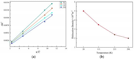 Modified Williamsone−Hall plots and dislocation density of the sample after fracture at different temperatures; (a) modified Williamsone−Hall plots; (b) dislocation density.