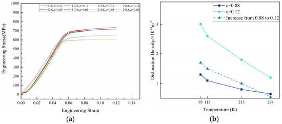 Stress−strain diagram and dislocation density of the sample at different temperatures with different deformation amounts; (a) stress−strain diagram; (b) dislocation density.