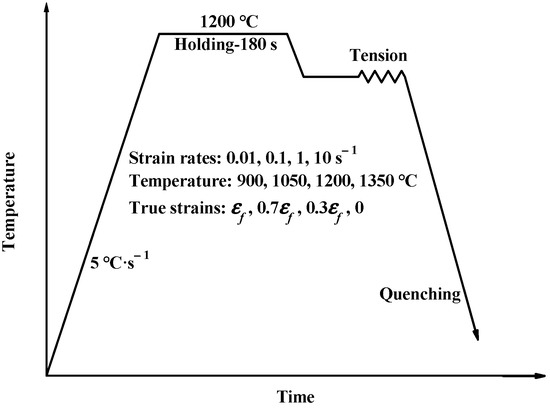 Isothermal tension tests have been conducted using a Gleeble-3500 thermo-mechanical simulator to study the mechanism of damage and the effects of temperature and strain rate on plastic damage. Cylindrical tension specimens with a diameter of 10 mm and a length of 120 mm were mechanically extracted from Billet 1. Figure 3 shows the experimental procedure for isothermal tension tests. First, each tension specimen was heated at 5 °C·s−1 to 1200 °C and soaked for 180 s to austenization. The tension specimens were then cooled or heated to different target deformation temperatures. Finally, the tension specimens were stretched under different strain rates to the true strains of , 0.7, 0.3, and 0, where represents the true strain when the specimen is cracked. Specimens were cooled immediately after deformation.