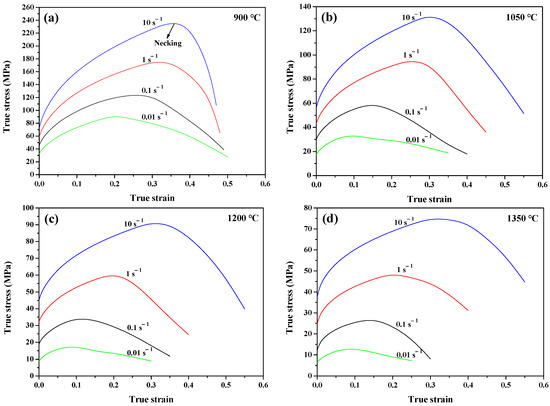 True flow stress curves of tension specimens under different strain rates and deformation temperatures: (a) 900 °C, (b) 1050 °C, (c) 1200 °C, (d) 1350 °C.