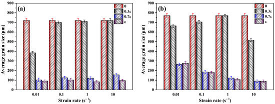 Average grain sizes of the tension specimens at different strain rates and deformation temperatures: (a) 900 °C, (b) 1200 °C.