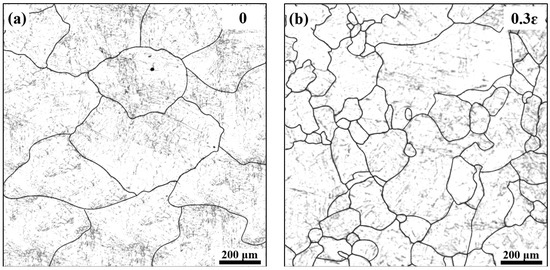 The average grain sizes of the tension specimens at different strain rates and deformation temperatures are shown in Figure 6. In general, the average grain size increases with the increase in deformation temperature. When the deformation temperature reaches 900 °C, the average grain size decreases with increasing strain rate, as shown in Figure 6a; however, when the deformation temperature reaches 1200 °C and the strain rate reaches 0.01 s−1, the average austenite grain size decreases and then slightly increases with increasing strain, as shown in Figure 6b. This phenomenon will be discussed in conjunction with the microstructure observations.