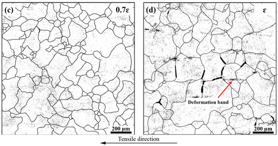 The microstructures of the tension specimens for different strains when the deformation temperature is 1200 °C and the strain rate is 0.01 s−1 are shown in Figure 7. To visualize the distribution characteristic of microstructure, the real grain boundaries in Figure 7 are highlighted using black lines. The initial coarse austenite grain size is approximately 770 μm, as shown in Figure 7a. When the strain is 0.3ɛ, the recrystallized grains begin to nucleate at the austenite grain boundaries and the austenite grains are refined as shown in Figure 7b. When the strain increases to 0.7ɛ, the average austenite grain size is further refined to 265 μm, as shown in Figure 7c. As the strain continues to increase, deformation bands form in the tension direction. Necking occurs prior to fracturing in the tension specimens, accelerating the increase in plastic damage. Grain boundary slip between large grains is more likely to produce plastic damage and form grain boundary cracks, as shown in Figure 7d. At this time, the austenite grains are less affected by the level of deformation and the average grain size increases to 276 μm due to high temperature.