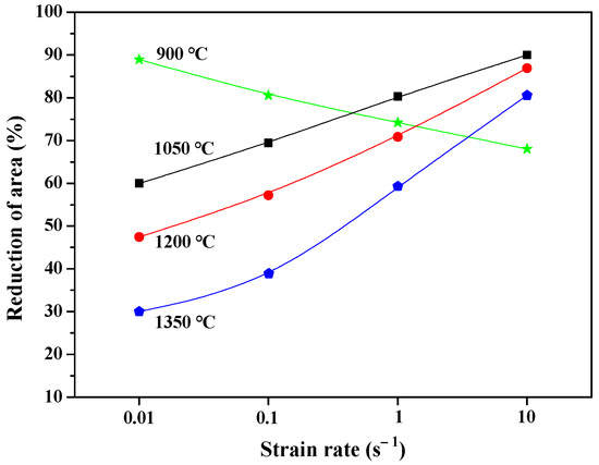 Reduction of area is an important index for evaluating high temperature plasticity. Figure 8 shows reduction of area for the tension specimens at different strain rates and deformation temperatures. When the deformation temperature is 900 °C, all the reduction of area under different strain rates are greater than 60%. As the strain rate increases, the reduction of area of the specimen decreases. When the deformation temperature is above 1050 °C, the reduction of area of the specimen increases with increasing strain rate. The different trends in the reduction of area at 900 °C and other deformation temperatures are determined based on the damage mechanism, which will be discussed later in conjunction with the observation of fracture morphology and microstructure.