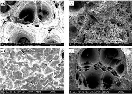 Fracture morphologies of the specimens at 900 °C (a) 0.01 s−1, (b) 10 s−1; and at 1200 °C (c) 0.01 s−1, (d) 10 s−1.