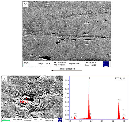 Microstructure of tension specimen at a temperature of 900 °C and a strain rate of 0.1 s−1: (a) inclusion damage; (b) MnS inclusions and EDS.