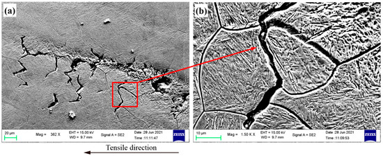 Microstructure of tension specimen at a temperature of 1200 °C and a strain rate of 0.1 s−1: (a) grain boundary damage; (b) detailed view of the damage.