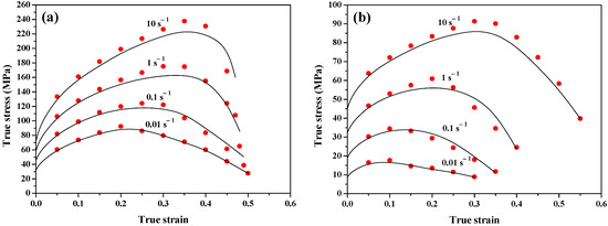 Comparison of experimental (symbols) and computed (solid curves) flow stress values measured at deformation temperatures of (a) 900 °C and (b) 1200 °C.