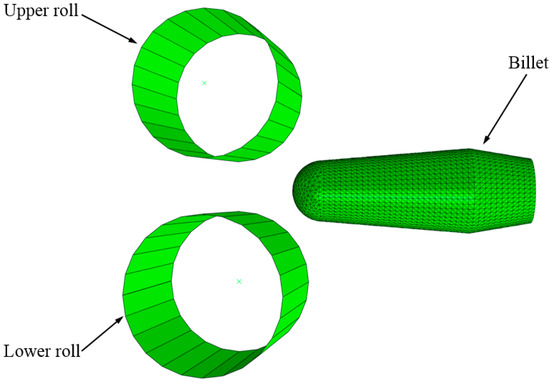 The initial temperature for the billet during reduction pretreatment was maintained at 900 °C on the surface and above 1300 °C in the core [18]. The initial austenite grain size was assumed to be 750 μm based on the experimental results of reduction pretreatment. The coulomb friction was adopted between the billet and the roller, and the friction coefficient was assumed to be 0.3. The rolling schedule in the simulation was set to be the same as that in the reduction pretreatment experiment. Thermal and mechanical properties of the billets are given in Table 6.