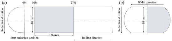 Analysis area during reduction pretreatment (a) in the rolling direction and (b) the cross section with a 26% reduction.