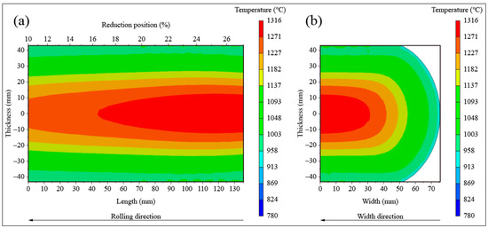 The temperature distribution in the rolling direction during reduction pretreatment is shown in Figure 19a. The abscissa and ordinate represent the length and thickness of the billet on the longitudinal section, respectively. In the thickness direction, the temperature at the center of the billet is obviously higher than on the surface. Therefore, the center deformation resistance is low. Figure 19b shows the temperature distribution on the cross section with 26% reduction. In the width direction, the temperature at the center is about 1315 °C and the temperature on the surface is 900–950 °C.