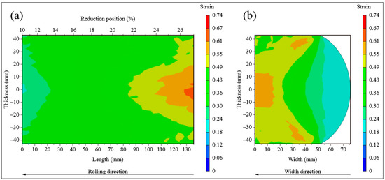 Distribution characteristics of the strain (a) in the rolling direction and (b) the cross section with 26% reduction.