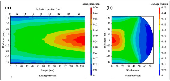Distribution characteristics of plastic damage (a) in the rolling direction and (b) the cross section with 26% reduction.