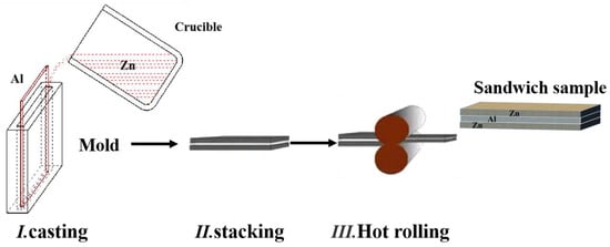 Currently, many processes have been developed to prepare macro-scale LMCs, including rolling [], extrusion [], deposition [], spraying [], wire arc additive manufacturing (WAAM) [], etc. Compared to other preparation processes, rolling can obtain the required plate size more easily [,], and a large number of LMCs with excellent properties, such as Ti/Al [], Cu/Al [], Mg/Al [], and Cu/Cu [,], have been successfully prepared. However, at present, research on LMCs is mainly focused on the combination of face-centered cubic (FCC) metals or FCC and body-centered cubic (BCC) metals, while there is relatively less research on composites containing hexagonal close-packed (HCP) metals as component materials. Moreover, in HCP LMCs, two oxide films break independently of each other rather than coherently with cubic metals for HCP metals, and thus, the bonding on the larger expansion interface is suppressed, resulting in poor bonding performance [].