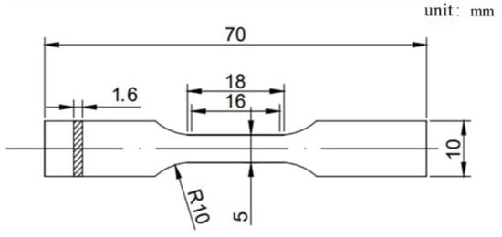 Finally, the laminated composite sheet with a thickness of 1.6mm was obtained by the hot-rolling process. The rolling mill equipment model here was Φ170 mm × 300 mm two high rolling mill. A schematic diagram of the preparation process of Al/Zn composite plate was shown in Figure 1. Determine the size of 10 mm × 12 mm, along the thickness direction for the selection of metallographic samples. The inlay used was a cold inlay containing acrylic powder and curing agent, and then polished and bolised its surface, after there are no obvious scratches on the surface of the sample, choose Keller’s reagent [] and 2.5 g Cr2O3 + 1.0 g Cu2SO4 + 40 mL H2O as etchants to etch Al and Zn respectively. The dog-bone-shaped samples were cut by wire EDM (model: SMDK-320T, Taizhou, China) according to GB/T228.1-2010. The sample size was shown in Figure 2.
