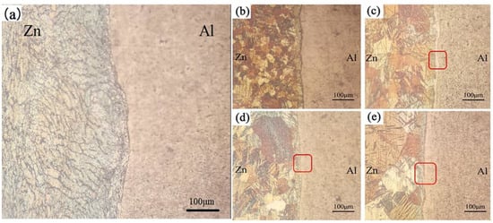 OM images of the samples under different annealing conditions, (a) rolled state; (b) 200 °C × 1.5 h; (c) 240 °C × 1.5 h; (d) 280 °C × 1.5 h; (e) 320 °C × 1.5 h. The red mark represents the interface zone.