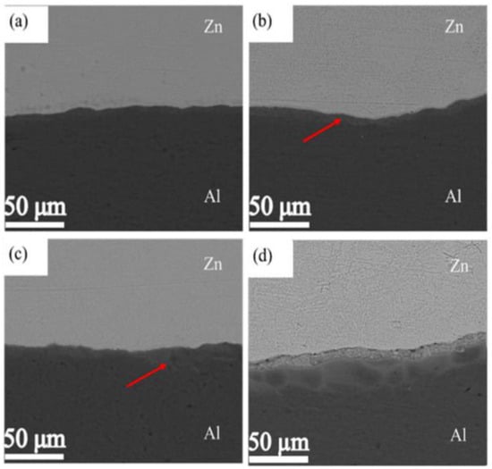 For LMCs, their excellent strength and toughness are not only from the metal components, but also from the synergistic reinforcement of the interface. The stress can be transferred from one metal component to another through the interface because of the existence of the interface, so as to enhance the strength and toughness of the composite at the same time. Nevertheless, chemical reactions can occur at the interface to produce intermetallic compounds (IMCs) for most research systems, but most of the them are brittle. When the interface impact zone grows to a certain thickness, the stress concentration will occur under the action of external stress, resulting in local plastic deformation, which will comprehensively affect the mechanical properties of the composite. For example, CuAl2, Cu9Al4 and other IMCs are generated between Cu/Al interface [], FeAl3 and Fe2Al5 at the Fe/Al interface [,], and TiAl3 and Ti2Al5 at the Ti/Al interface [].