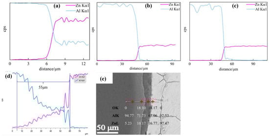 Figure 4 shows the SEM morphology images at different temperatures. All Al/Zn interfaces show obvious waveform morphology, which is attributed to the different flow characteristics of Al and Zn components, which lead to deformation incompatibility in the rolling process, resulting in shear deformation at the interface. At 200 °C, there is no obvious diffusion effect. However, as the temperature increases, interfacial atoms gain energy and are prone to diffusion, resulting in the formation of a layer of solid solution with inhomogeneous thicknesses at the interface, as indicated by the red arrow in the figure, which is mainly because the thermal expansion coefficients of the two components were different, local generation of micro-pores and cracks at the interface leads to changes in the path of atomic diffusion. After the annealing and subsequent cooling processes, different degrees of atomic diffusion are observed. When the temperature increases to 320 °C, the transition layer become wider, and it is almost located in the Al matrix. Figure 5 show the point EDS analysis and line scanning result at different annealing temperatures, respectively. The concentration curve across the interface assumes an “X” shape, indicating that atoms at the interface diffuse with each other. With the increase of temperature, the “X” type span becomes larger, means the transition layer becomes thicker, and the thickness of the diffusion layer is 55 μm at 320 °C for 2 h. Point analysis at Figure 5e shows that the diffusion direction of atoms at the interface is mainly Zn diffusion into Al.